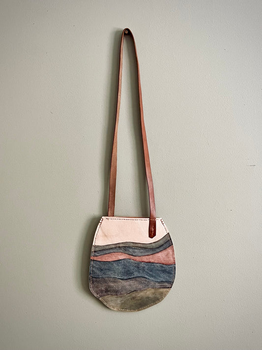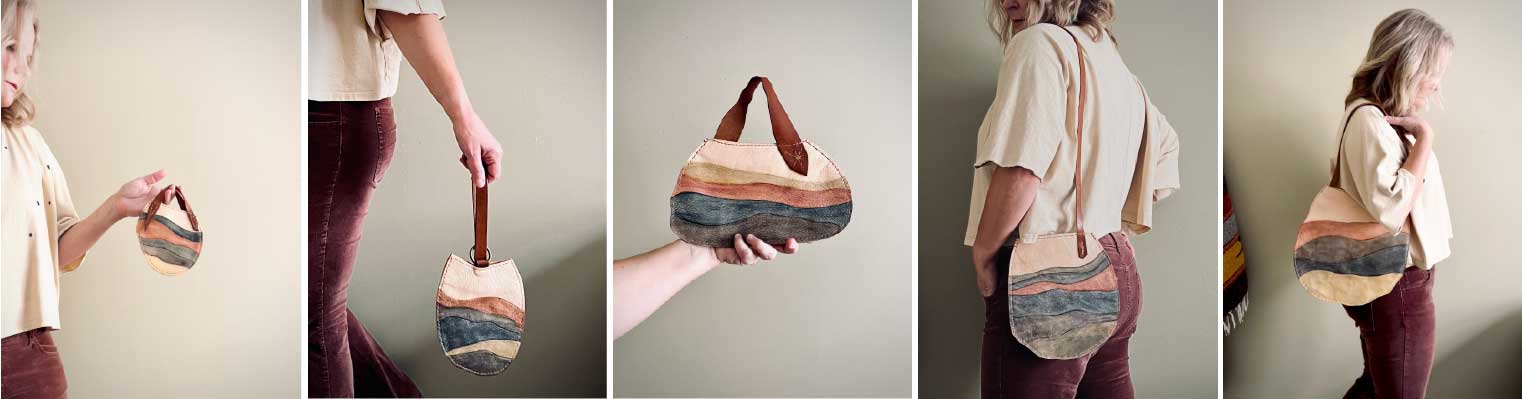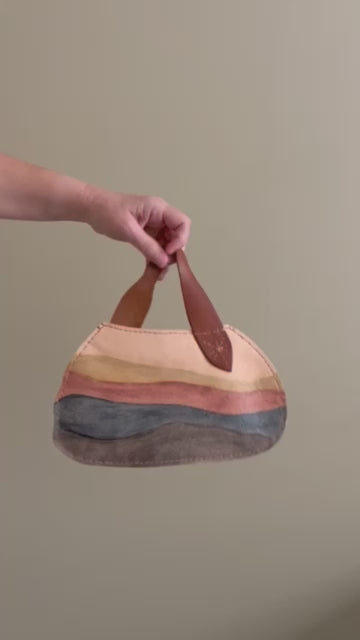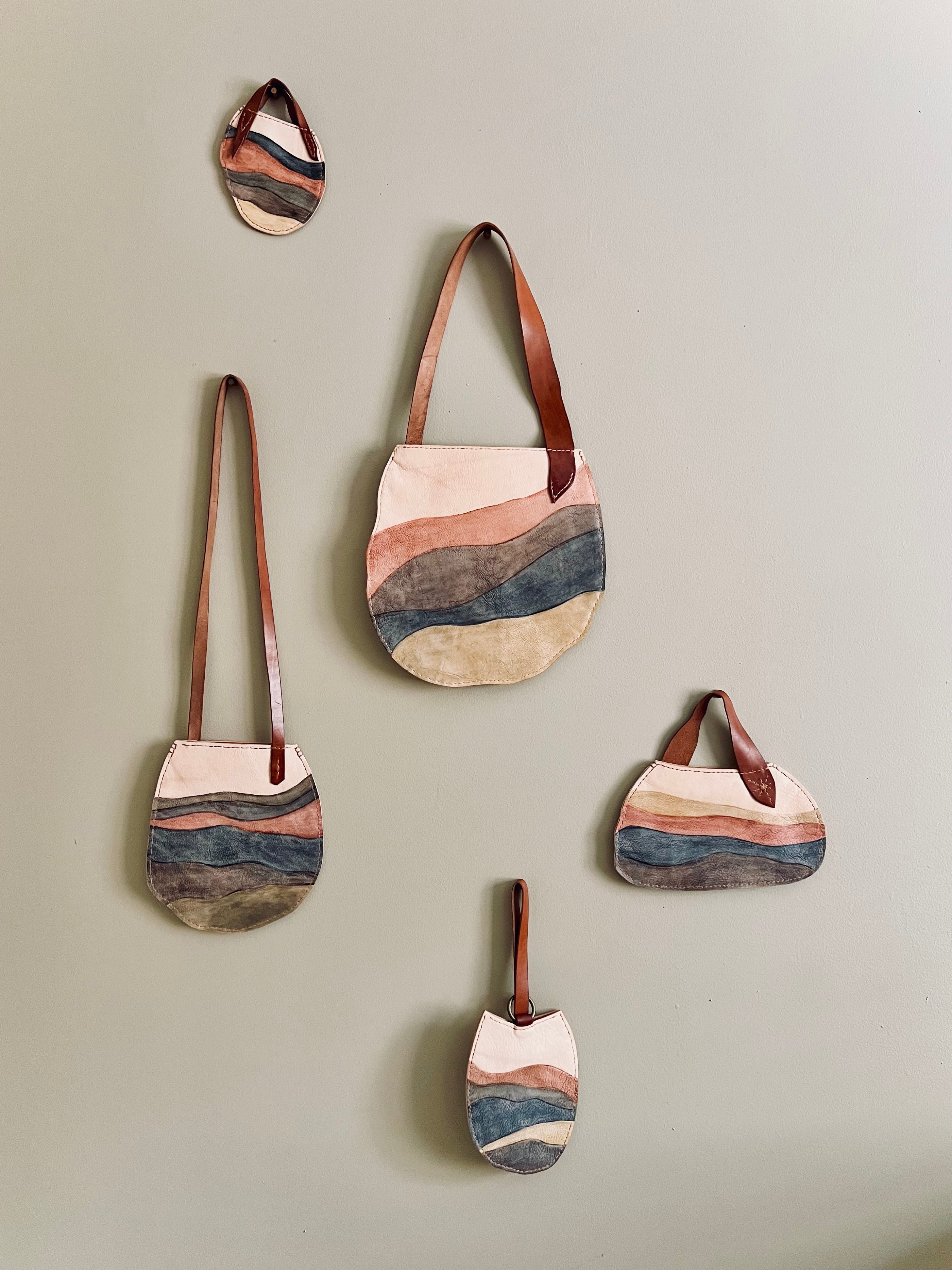 The shapes came first…hand-cut, unrehearsed, irregular in a way that felt perfect. Freeing actually. No patterns… just the leather, my hand and the blade. Then watercolor. Washed into the grain with almost no direction from me. Horizon lines in earth tones just effortlessly flowed and embedded themselves into the leather. I wanted the handles to be structural… artistic forms in and of themselves. The main bodies stayed minimal and flat so they could read as sculpture first, carry pieces second. Wearable art. Companion objects of atmosphere. Something you carry lightly to a gallery opening or set beside your favorite painting at home.