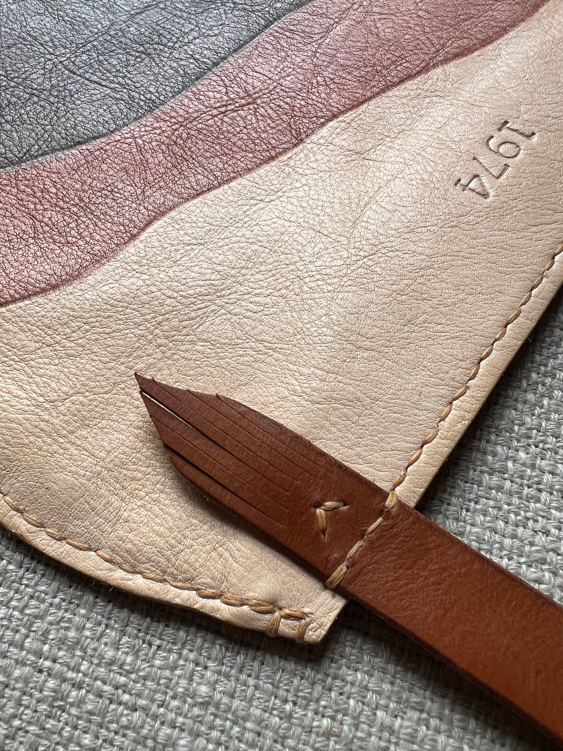 I love to use Smith’s All Natural Leather Balm on my leather goods. It's a non toxic leather conditioner designed to restore worn leather and protect new leather goods. Each piece that leaves my hands will have been swathed in it. If for some reason, a piece gets dirty (which in my eyes, that makes it all the more lovely) then use a damp cloth to see if that removes the stain. If a piece gets a water/rain stain, most likely it will dry and be fine. If not, then gently work the leather a bit. That helps to bring it back to a normal state. Leather is tough so don't be afraid to use your 1974 daily... Beat it up, hold it close and most of all, enjoy!